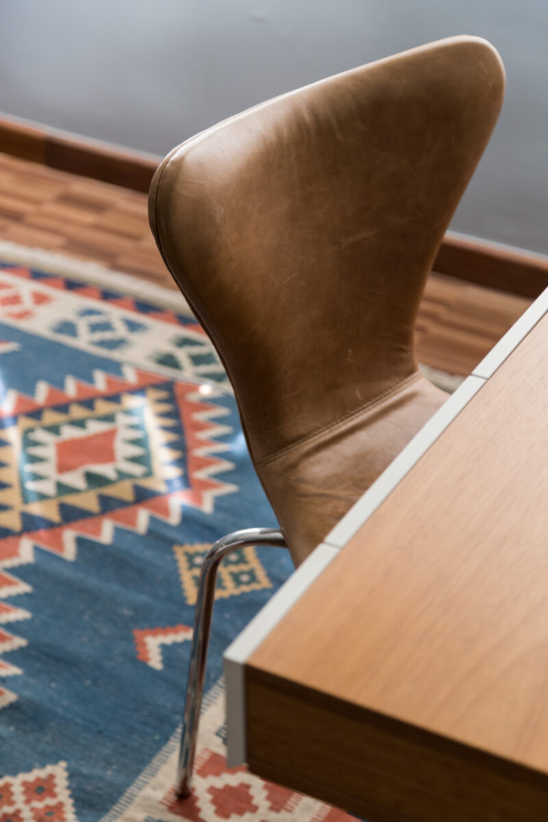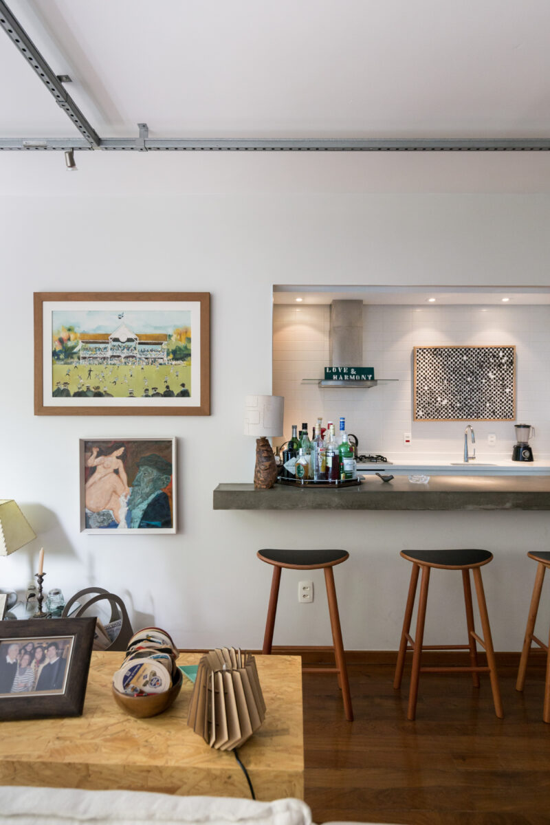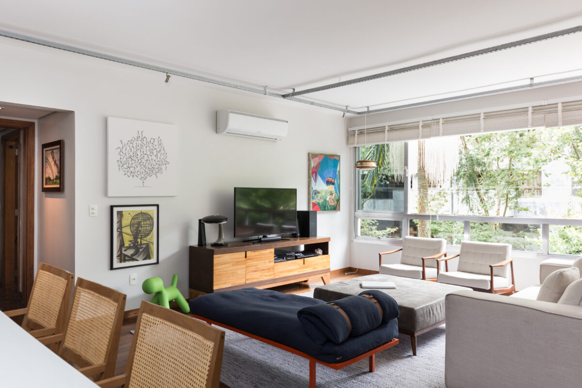 O antigo clássico com o novo contemporâneo. Um mobiliário retro anos 60, com obras de artes coloridas e abstratas.