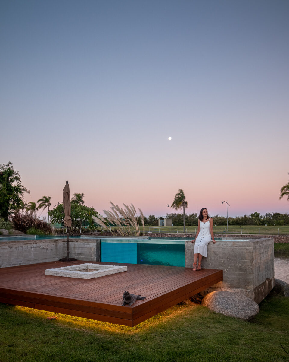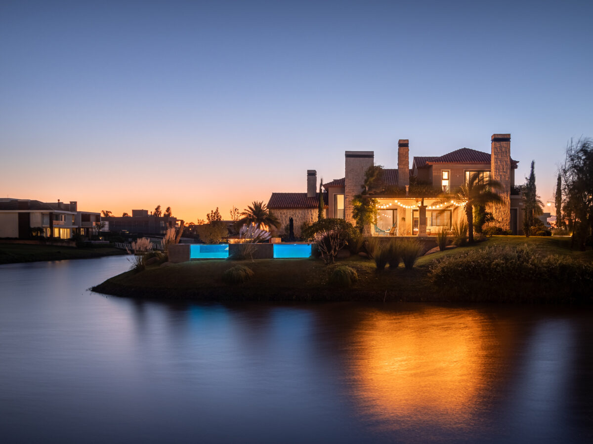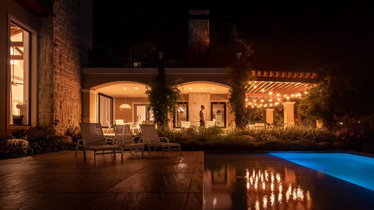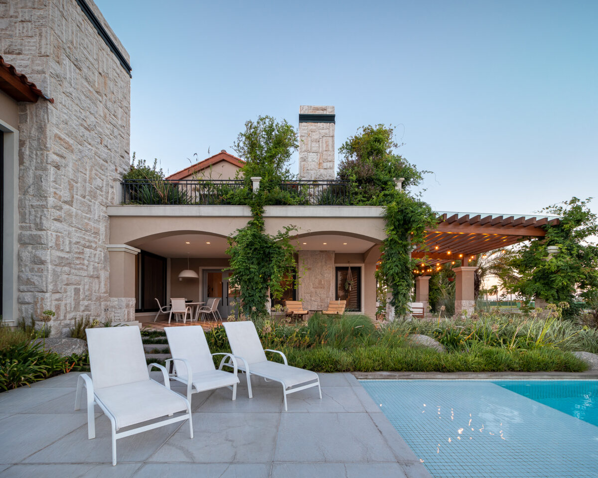 O acesso em pedras naturais e a textura das paredes externas em cor areia trazem as características da arquitetura espanhola para esta casa ampla. Os espaços externos e de lazer ampliam e transformam o ambiente, integrando a casa ao cenário natural ao mesmo tempo que reforça o estilo arquitetônico da construção.