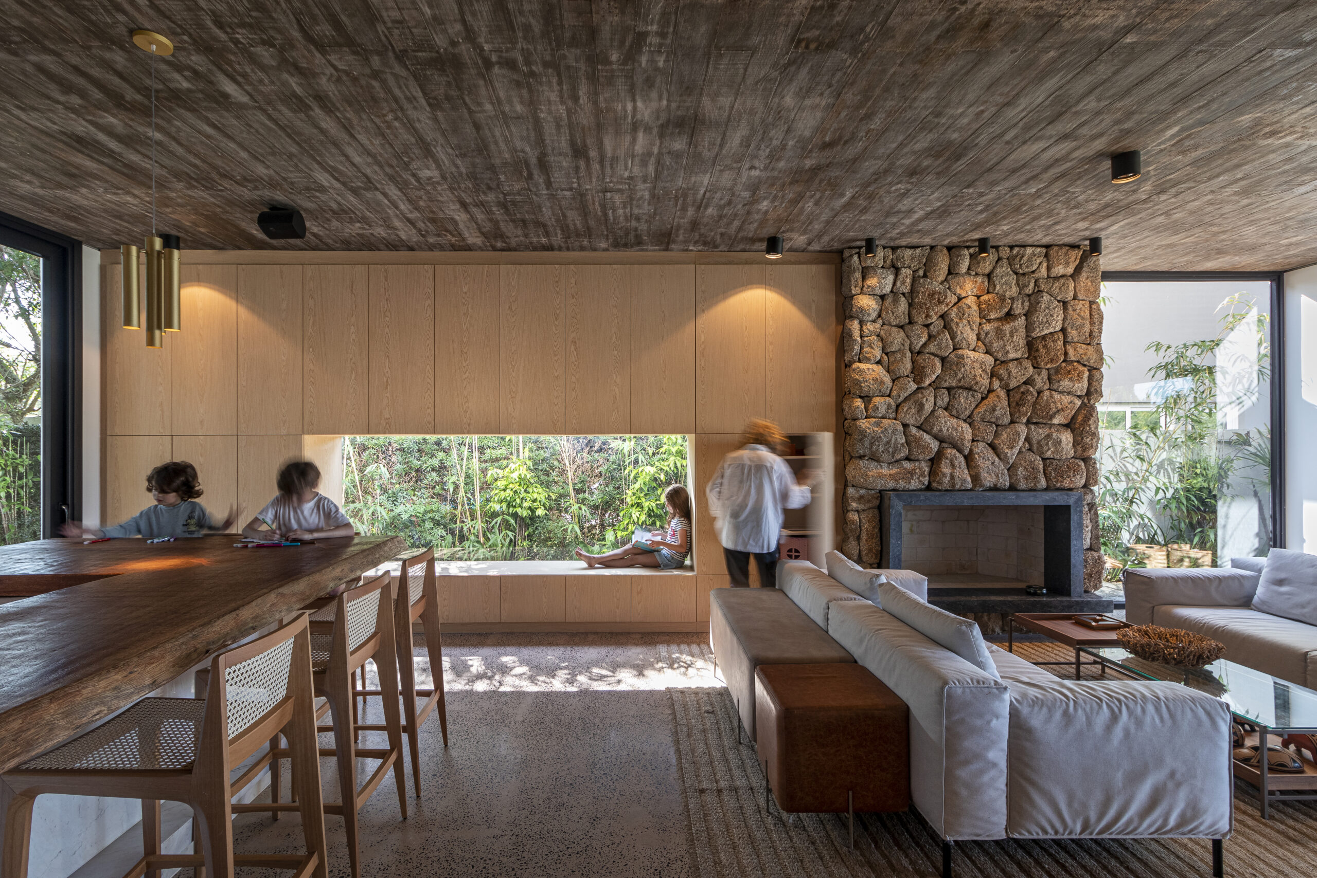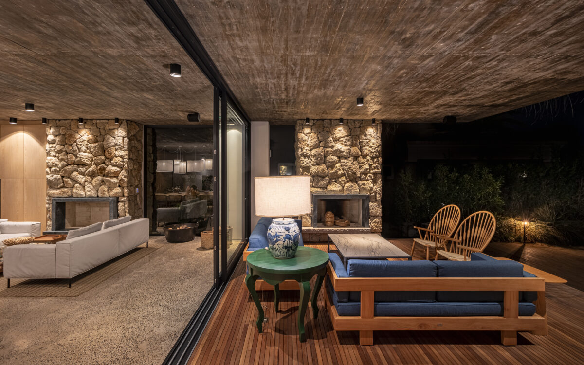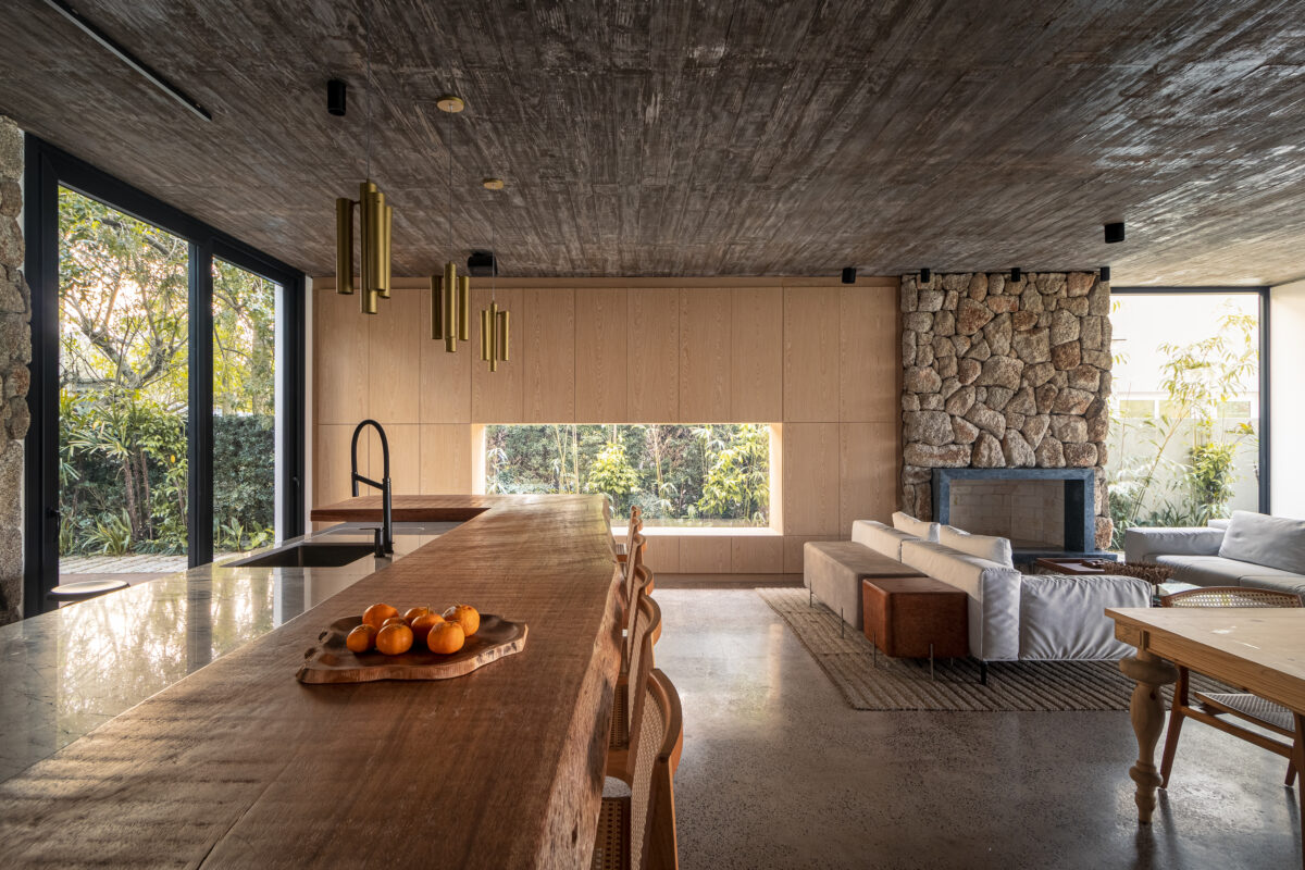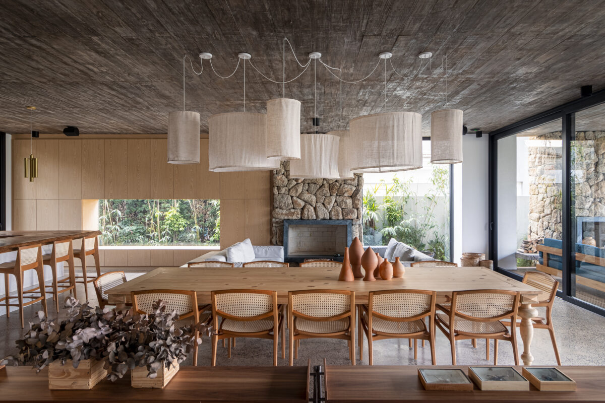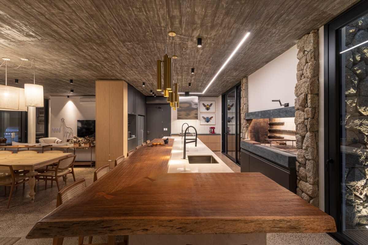 O uso de materiais rústicos, como o concreto aparente no forro e piso, a madeira bruta na bancada e em demais mobiliários, as pedras naturais como revestimento de lareiras e churrasqueiras, conferem a este projeto um ar despojado e simples, perfeitos para uma casa no litoral.
