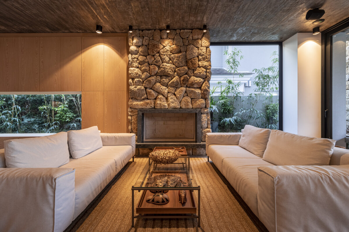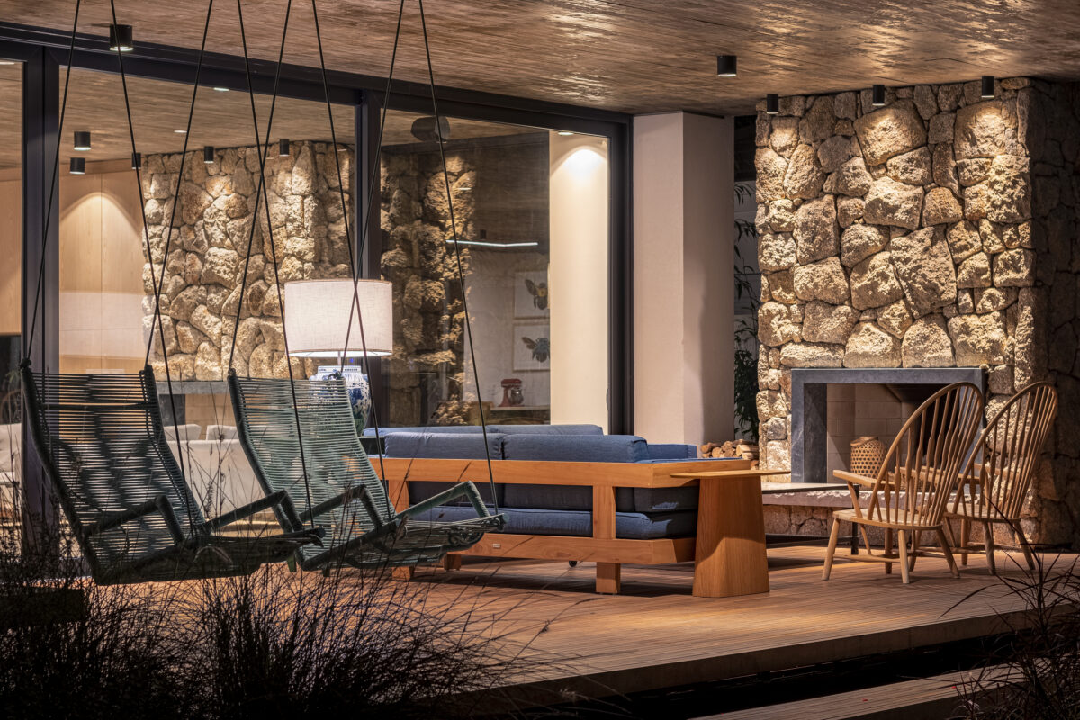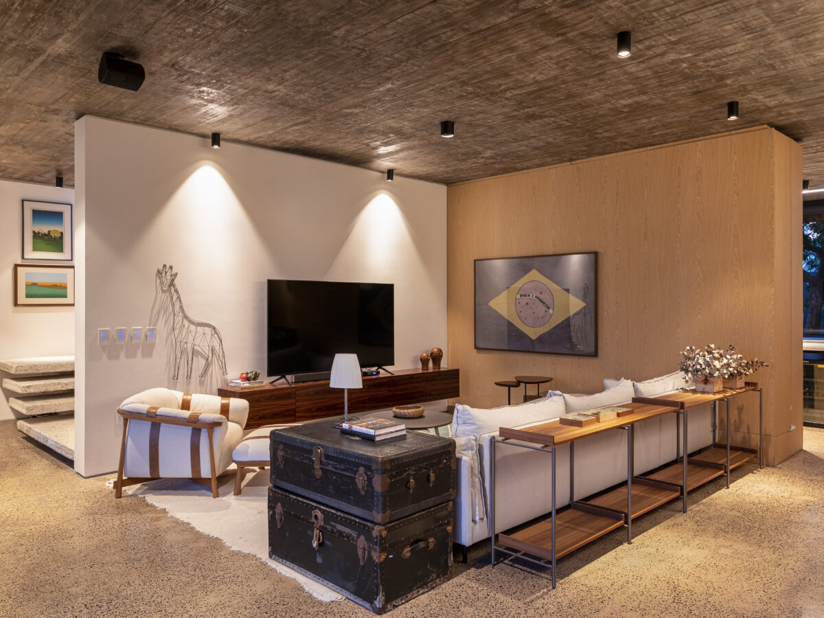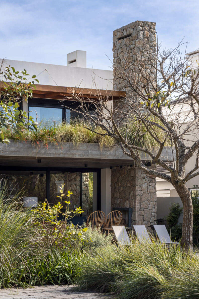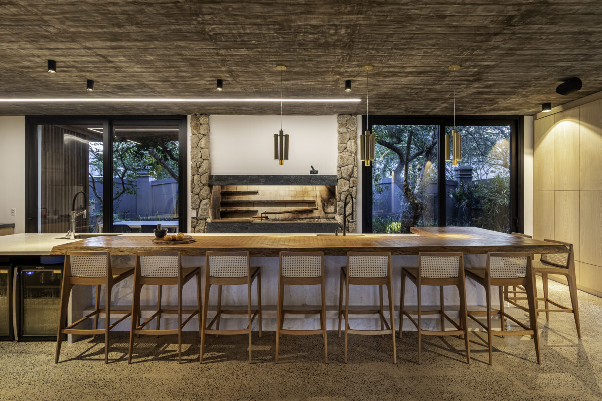 O uso de materiais rústicos, como o concreto aparente no forro e piso, a madeira bruta na bancada e em demais mobiliários, as pedras naturais como revestimento de lareiras e churrasqueiras, conferem a este projeto um ar despojado e simples, perfeitos para uma casa no litoral.