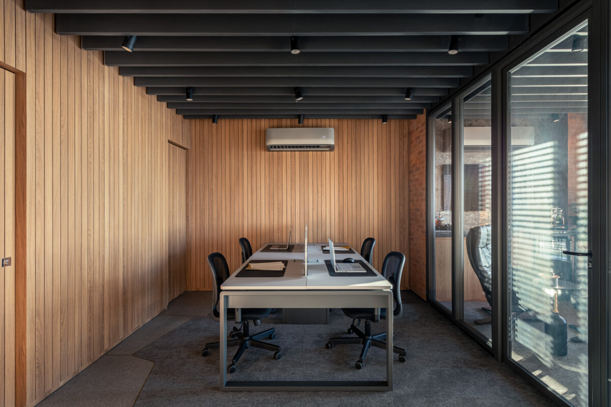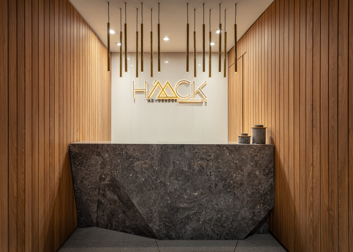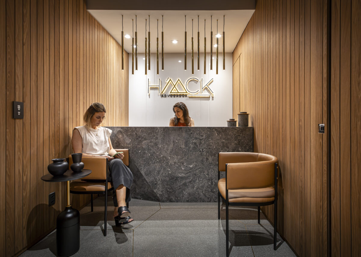 Buscando a harmonia entre estilo industrial e a sofisticação, neste projeto corporativo mesclamos elementos naturais como tijolo e madeira clara com iluminação embutida. Podemos observar um layout bem resolvido e funcional para uma sala de 44m² que comporta todas as suas necessidades.