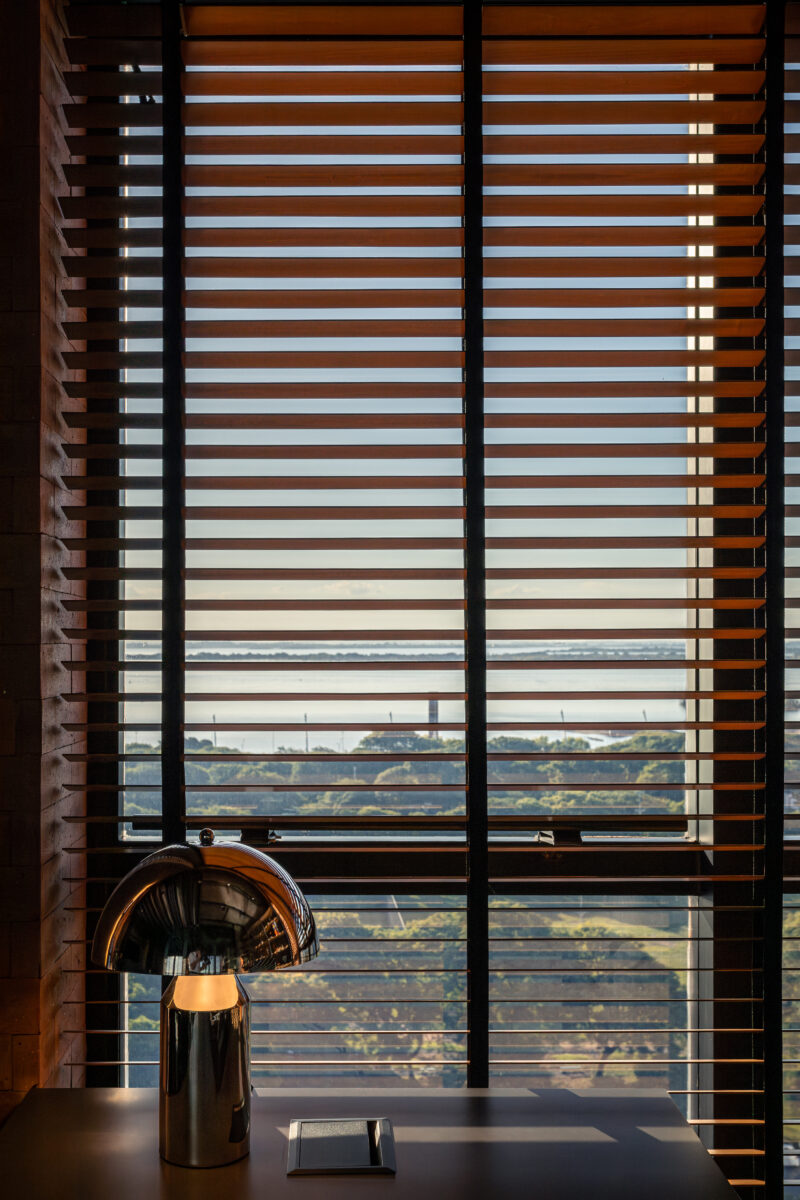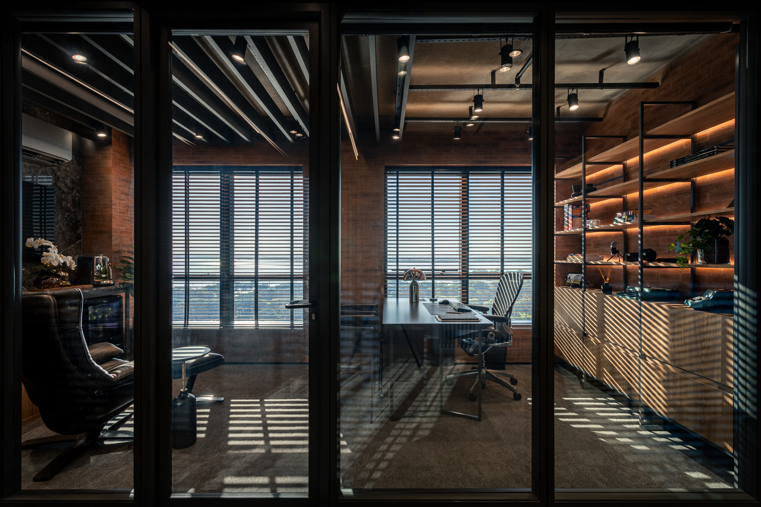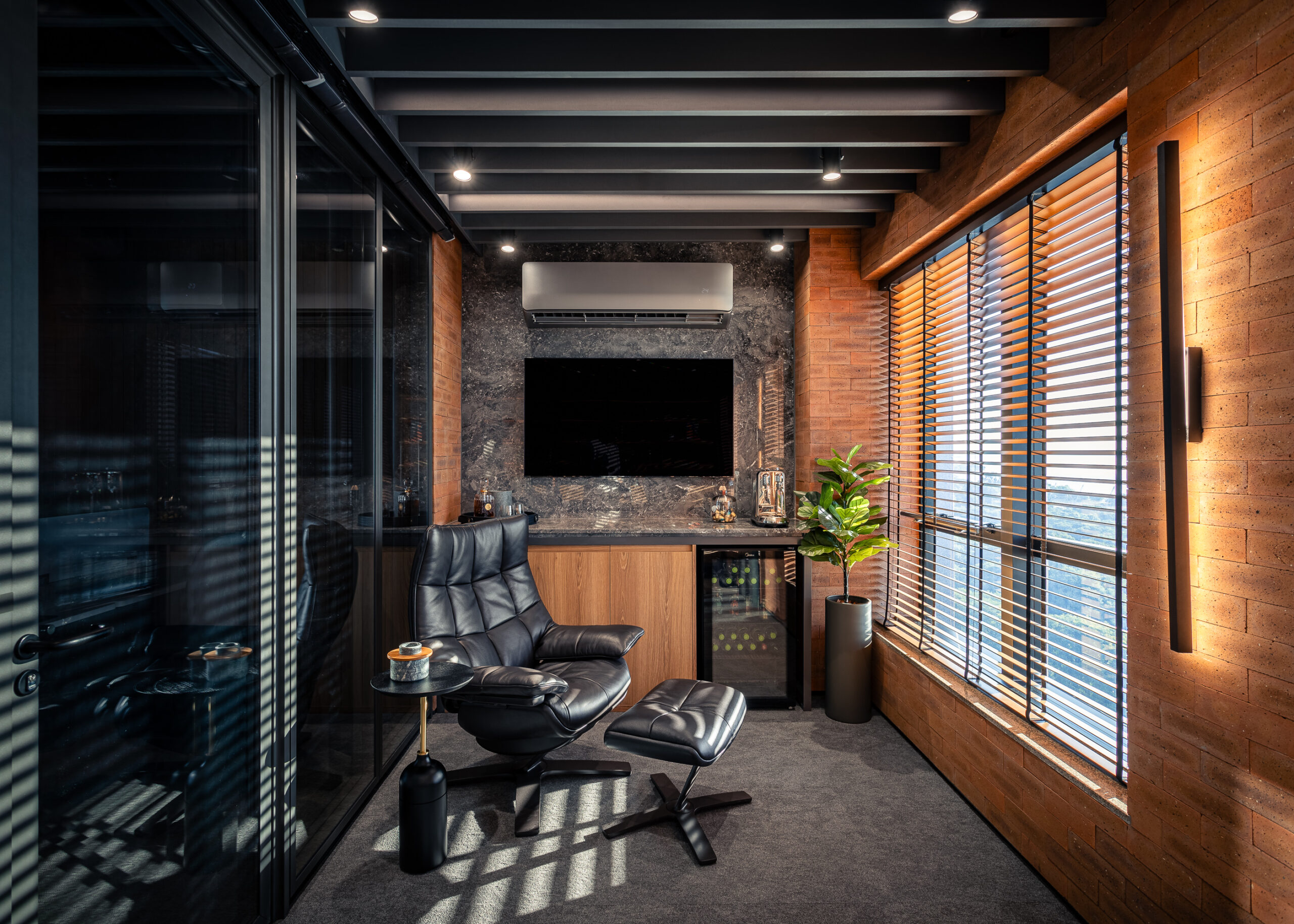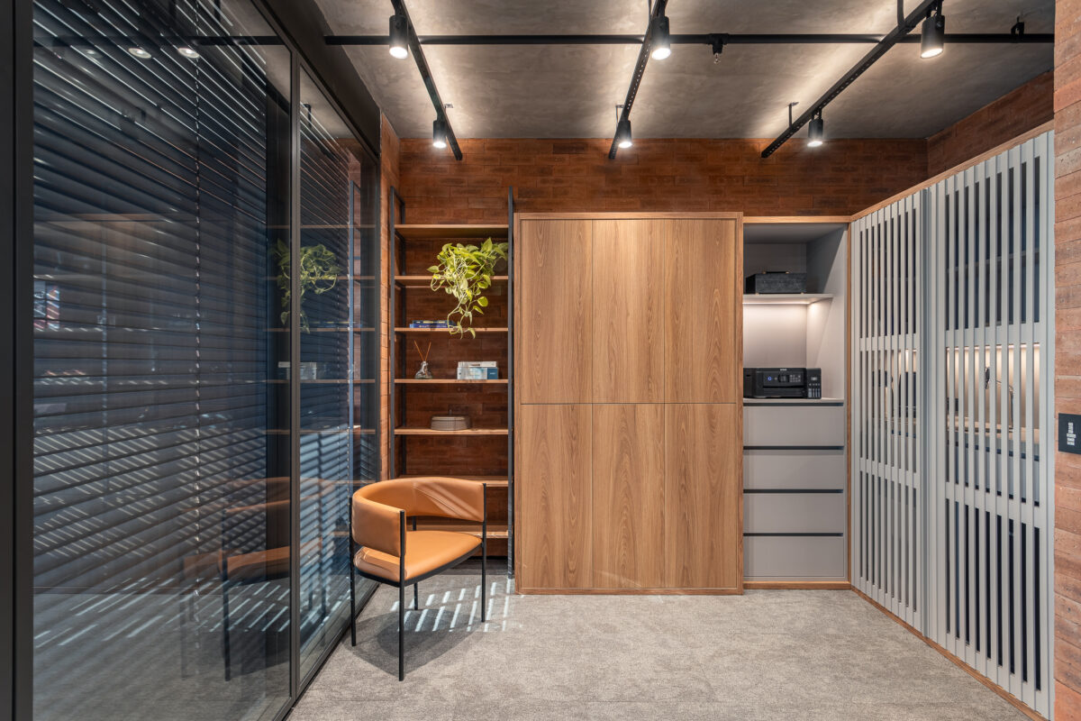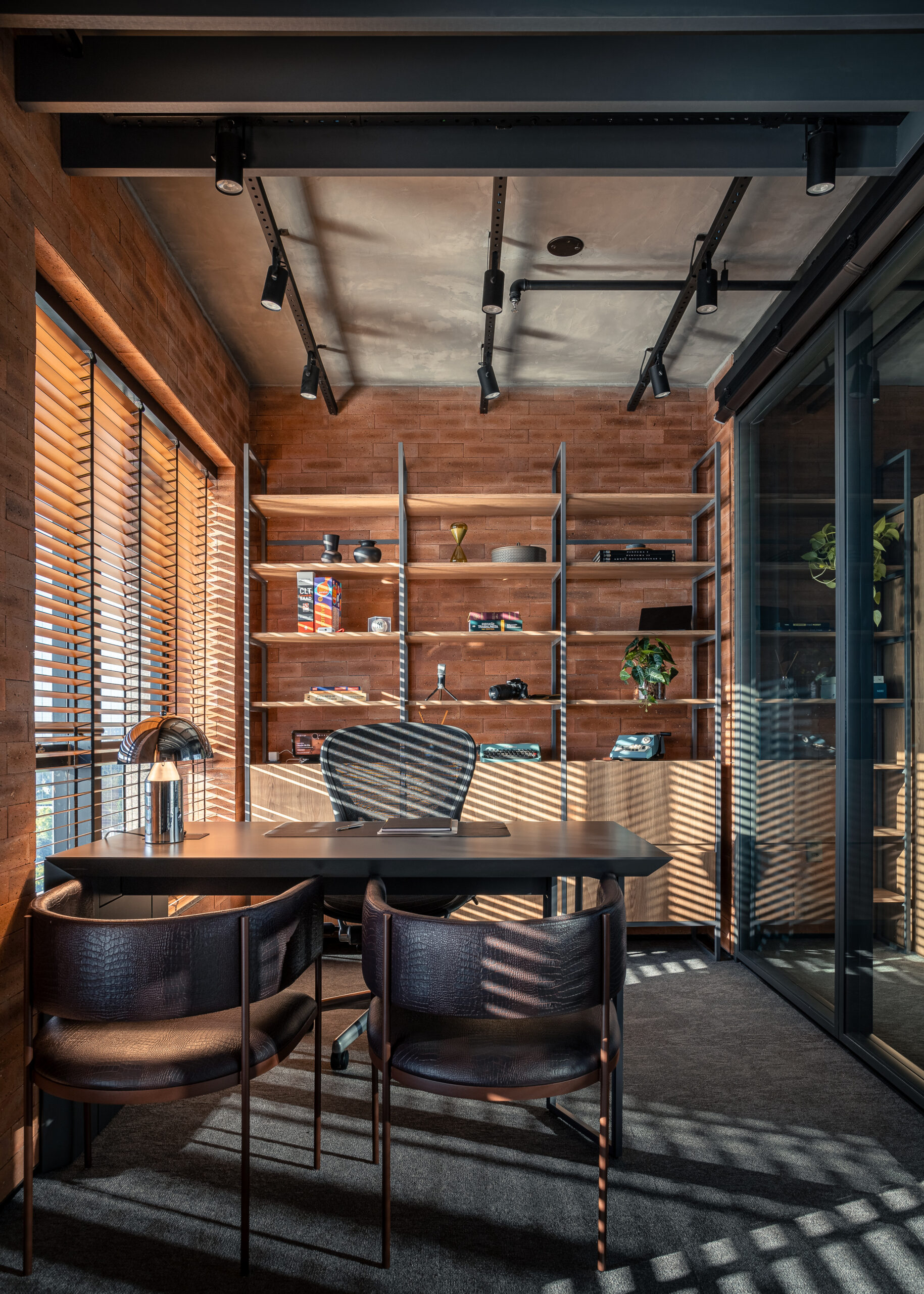 A sala do diretor evidencia o uso dos tijolos mostrando estilo industrial mais marcado, complementado com os detalhes em metais e luminárias pretas, alinhado ao uso de marcenaria e mármore, unido a sensação de aconchego a funcionalidade.