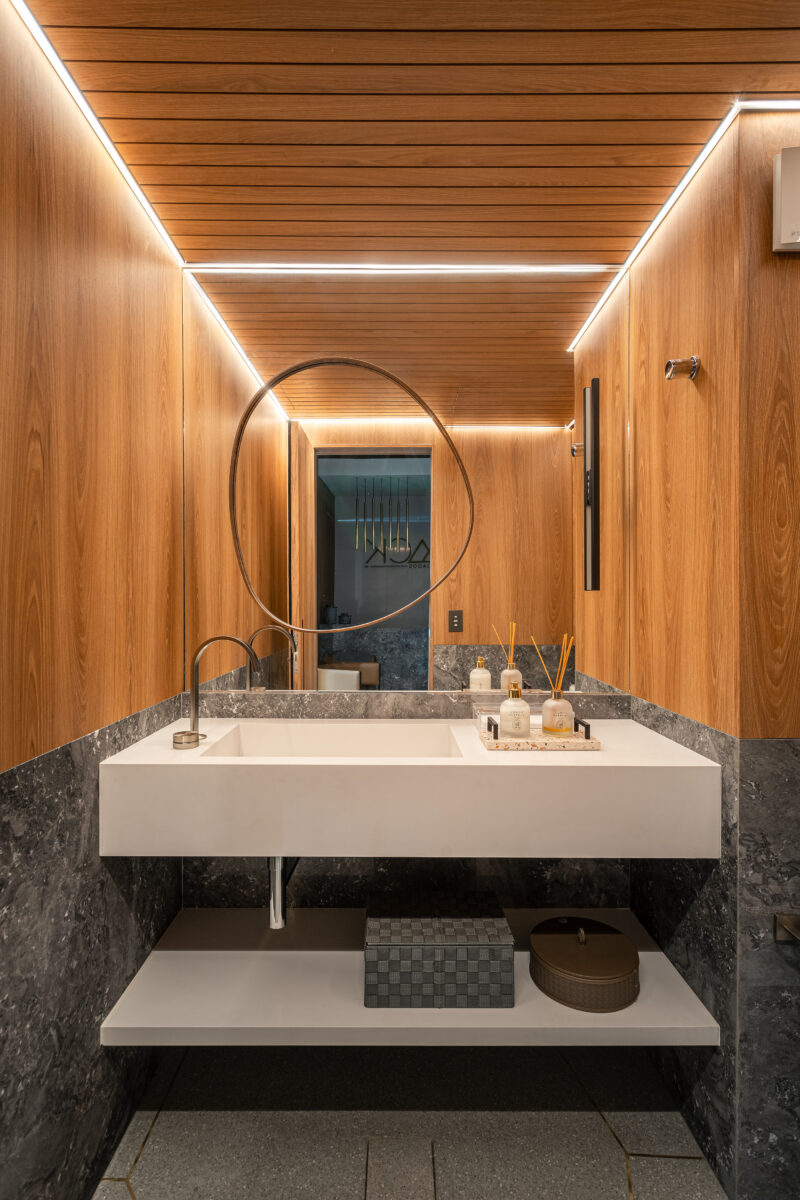 O uso planos na bancada de mármore interage com a paginação do piso em recortes orgânicos, complementando o ambiente temos a marcenaria que traz sensação de alongamento e amplitude.